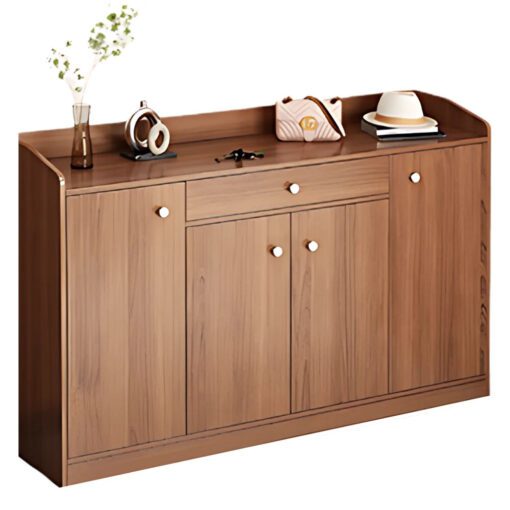 A spacious wooden shoe cabinet with closed storage and an open display shelf. Holds multiple pairs while enhancing your entryway with warmth and style.