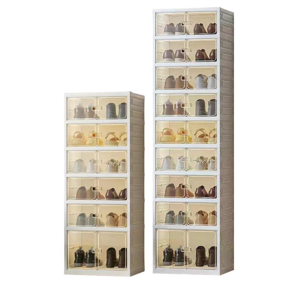 A wide, foldable shoe cabinet with dual rows and clear front visibility. Choose between 6-tier and 9-tier based on your storage needs.
