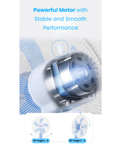 Adjustable Airflow – Features 3 fan speeds with a powerful 5-leaf blade system for optimal wind coverage, and smooth oscillation (70° horizontal / 50° vertical).