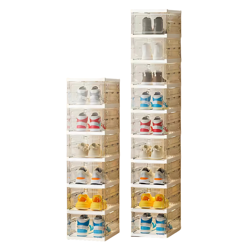A compact foldable shoe rack with clear front panels for easy viewing. Available in 6-tier and 9-tier variants to fit your needs.
